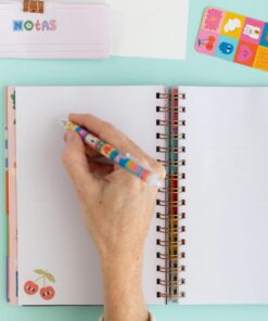 Es semana a la vista, tamaño A5, con tapa dura y elástico a tono. Encuadernación en espiral. Papel obra en su interior. Incluye señalador a juego confeccionado en cartulina. Medidas: 15,5 x 21 cm.