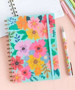 Tamaño A5 anillado con 70 hojas rayadas y elástico.