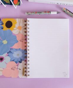 Tamaño A5 anillado con 70 hojas rayadas y elástico.