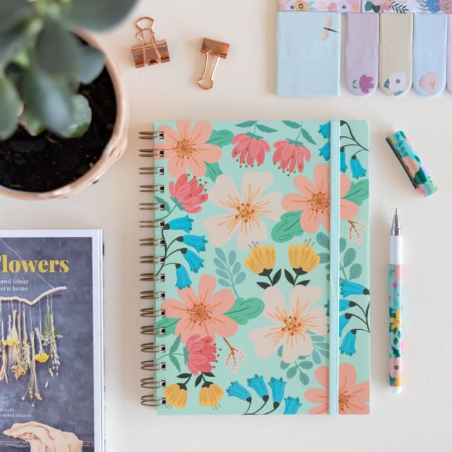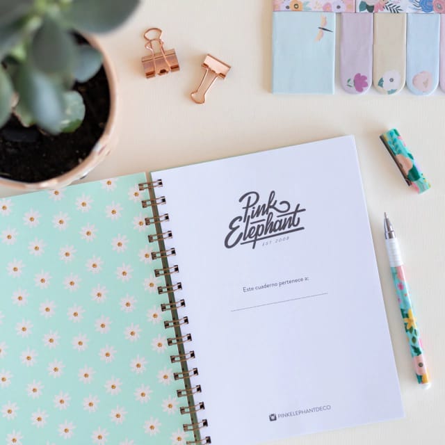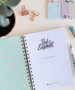 Tamaño A5 anillado con 70 hojas rayadas y elástico.