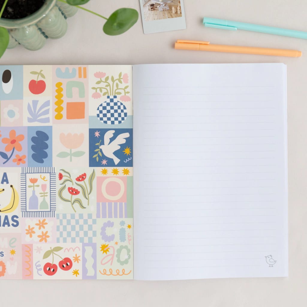 Libreta con tapas estampadas y encuadernación estilo acaballado, Incluye 40 hojas rayadas.