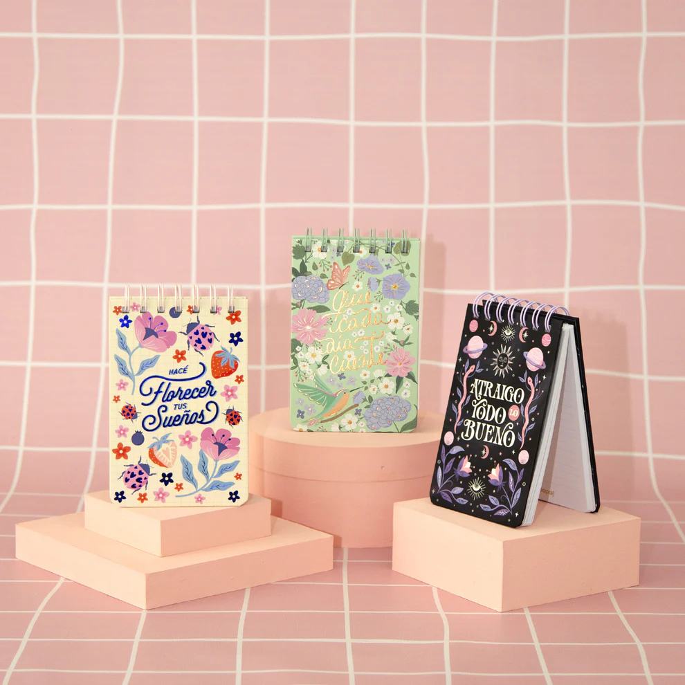 Con anillados a tonos de los diseños, puntas redondeadas y son tapa DURA! Impresión full color en retiraciones.