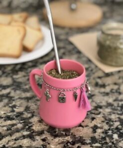 Mate plástico con asa en colores pastel, con cadena con dijes surtidos.