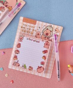Estas notas adhesivas cuentan con un diseño de Capybara super tierno, además cuenta con una mini birome .
