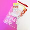 Incluye block de notas de 100 hojas, lapicera azul, señalador imantado y una cartita con amor. Todo en una bolsita reutilizable!