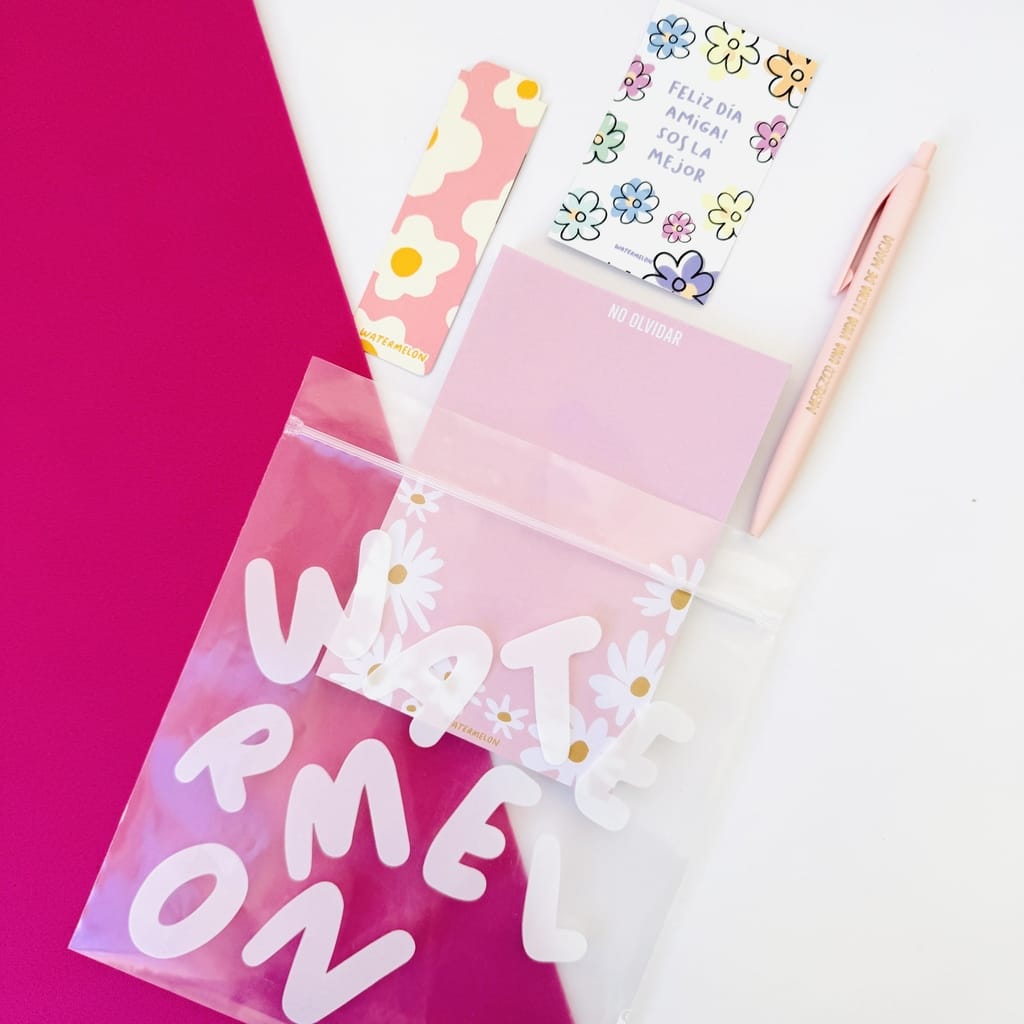 Incluye block de notas de 100 hojas, lapicera azul, señalador imantado y una cartita con amor. Todo en una bolsita reutilizable!