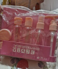 Vienen botellitas con diferentes picos: rociador y dosificador para cremas o shampoo/ crema de enjuague. Además cuenta con dos recipientes con tapta a rosca y una palita para llevar tus cremas específicas a todos lados.