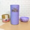 Tiene pico vertedor, viene en colores pasteles y frase en dorado “Think positive” (Piensa en positivo) impresa alrededor de toda la lata (no sólo en el frente).